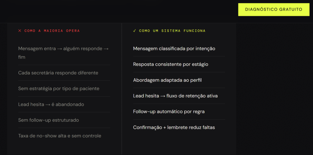Na prática, clínicas que estruturam o atendimento antes de automatizar aumentam significativamente a taxa de agendamento e reduzem faltas.