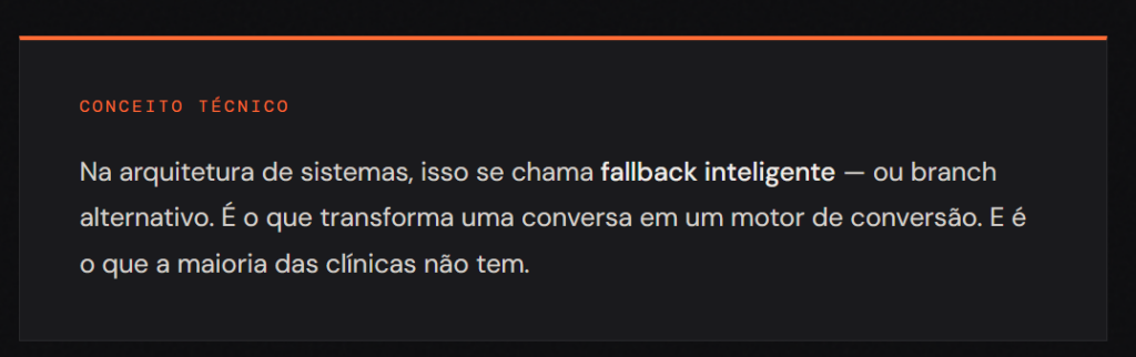 Na arquitetura de sistemas, isso se chama fallback inteligente – ou branch alternativo. É o que transforma uma conversa em um motor de conversão. E é o que a maioria das clínicas não tem.